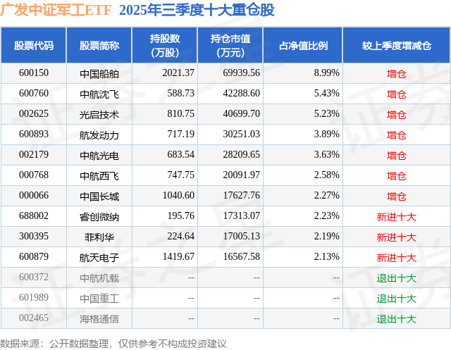 从基金限度来看,广发中证军工ETF基金2025年三季度公布的基金限度为77.81亿元,较上一期限度56.74亿元变化了21.07亿元,环比变化了37.13%。该基金最新一期金钱树立为:股票占净值比99.81%,债券占净值比0.07%,现款占净值比0.22%。从基金抓仓来看,该基金当季前十大股票仓位达38.57%,第一大重仓股为中国船舶(600150),抓仓占比为8.99%。